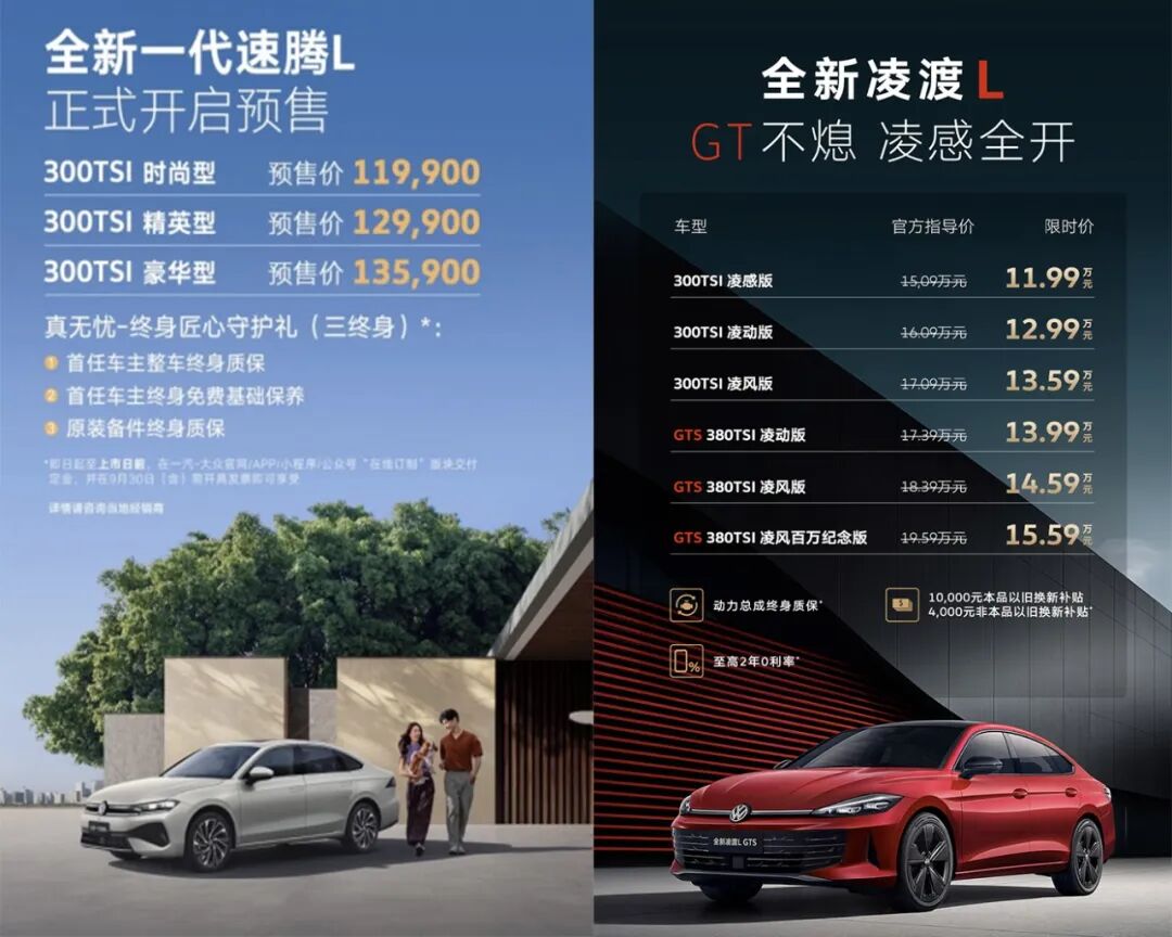 首先,在大家最关心的价格部分,全新凌渡L被称为最贵大众A级轿车,个性化的轿跑设计是溢价的资本,凌渡L的价格也确实对得上这一名号,目前全新凌渡L给出的指导价为15.09万,新增的GTS版本为17.39万,同时也给出了限时价,常规版本和GTS版本分别为11.99-15.59万起(截止至2025年9月30日)。这也是上汽大众最近习惯性的政策,限时一口价作为实际成交价,既要保证价格原有的价格体系,也要让利于消费者。