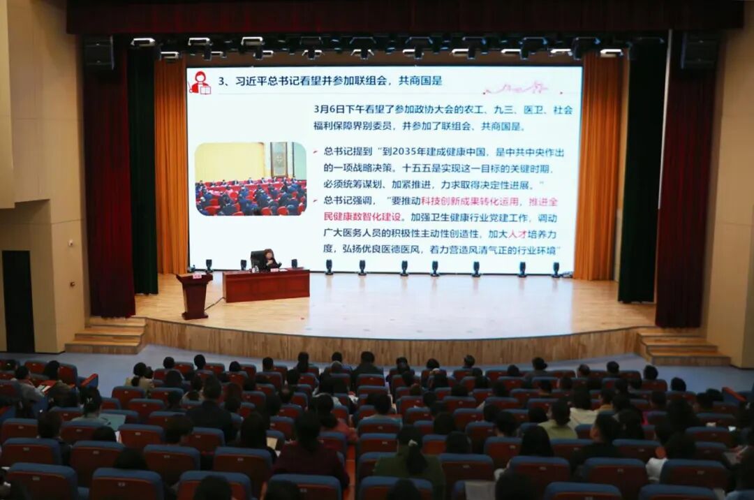 聘任仪式后,孙蓉教授以《学习全国两会精神 聚力健康中国建设》为题作专题宣讲。她结合参会履职的亲身经历,紧扣2026年全国两会核心精神,系统解读了习近平总书记关于卫生健康事业发展的重要论述,深入阐释了“十五五”时期推进健康中国建设的战略目标与实践路径。宣讲中,孙蓉教授重点分享了围绕中医药传承创新、老年人用药安全等民生关切建言献策的思考与体会,既有宏观政策的深度剖析,又有行业发展的精准研判,更有对职业教育与人才培养的殷切期望。整场报告站位高远、内涵丰富、贴近实际,帮助师生进一步深化了对两会精神的理解,明晰了新时代医药卫生健康工作者的使命担当。