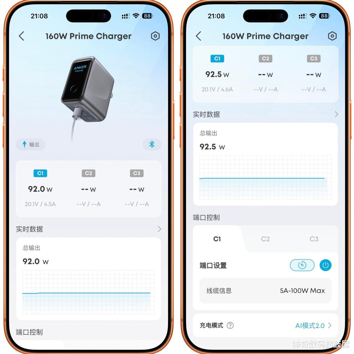 还有个我特别喜欢的AI模式 2.0,持续监测所有端口剩余功率,每两分钟智能重新分配,实现效率最大化。实测体验:当同时为iPhone和MacBook充电时,传统多口充电器在手机充满后,功率从30W降至10W以下,且电脑功率维持在90W不变,导致总功率浪费。而Anker Prime 智显充Pro 160W充电器能将闲置的功率动态分配给电脑,使其功率从100W提升至120W以上,总功率利用率显著提高。简单说,就是在多设备同时充电,无需手动干预,就可以给每个设备匹配极致充电效率。