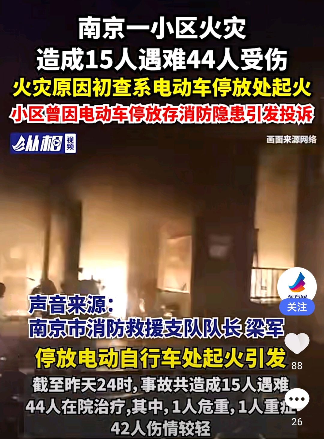 还有就是电池容量小,48V12Ah小铅酸电池夏季续航30公里,冬季受低温影响电池容量衰减续航直接打五折,仅能跑十几公里。最让人害怕的是锂电池车型频繁爆燃起火,比如2024年2月23日凌晨4时35分,南京雨花区明尚西苑一小区电动车起火,向高处蔓延共造成15人遇难、44人受伤的惨剧。事故原因是架空层停放的电动自行车电池起火引燃,几乎所有的电动自行车起火都是使用锂电池造成的。