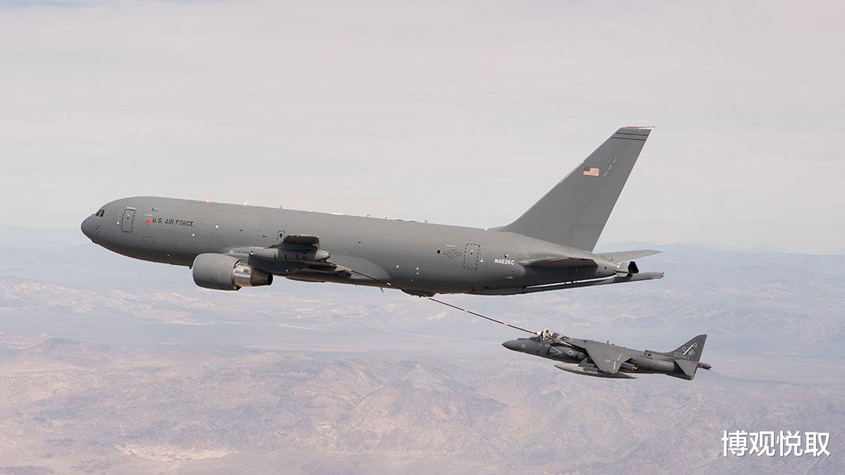AV8B“鹞式”垂直起降战机因起降条件特殊,对加油灵活性要求高,KC46的软管系统为其提供了可靠的“空中补给线”。