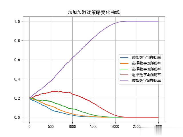 import numpy as np def simulate_game(policy): """ 模拟加加加游戏,游戏介绍: 1. 两个玩家每一回合没人选择一个1~5的数字; 2. 在100回合之后,每个人将它们选择的数字加起来; 3. 总和最高的人获胜。 返回值:(胜者的选择,负者的选择) """ # 记录玩家选择数字1~5的次数 player_1_choices = {1: 0, 2: 0, 3: 0, 4: 0, 5: 0} # 记录玩家选择数字的总数 player_1_total = 0 player_2_choices = {1: 0, 2: 0, 3: 0, 4: 0, 5: 0} player_2_total = 0 # 运行100回合 for i in range(100): # 按照policy指定的概率选择1~5中的数字 player_1_choice = np.random.choice([1, 2, 3, 4, 5], p=policy) player_1_choices[player_1_choice] += 1 player_1_total += player_1_choice player_2_choice = np.random.choice([1, 2, 3, 4, 5], p=policy) player_2_choices[player_2_choice] += 1 player_2_total += player_2_choice if player_1_total > player_2_total: winner_choices = player_1_choices loser_choices = player_2_choices else: winner_choices = player_2_choices loser_choices = player_1_choices return (winner_choices, loser_choices)接下来就持续模拟游戏,初始策略是所有的数字选择概率都是相同的,为20%,每模拟一局游戏,就将胜利者选择数字的概率增加一点,而失败者选择数字的概率减少一点,这个更新选择数字概率的过程就是“学习”。下面的代码模拟了3000局游戏,并将策略的变化绘制成了曲线。