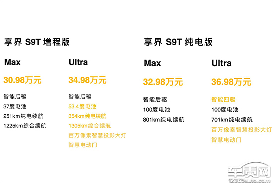 动力方面,新车提供增程版和纯电版两种动力可选,其中增程版车型搭载华为雪鸮智能增程系统,由1.5T发动机与电动机组成,CLTC纯电续航里程354km,CLTC综合续航里程达到1305km;纯电版车型标配容量为100kWh的巨鲸电池组,CLTC纯电续航里程最高可达801km。