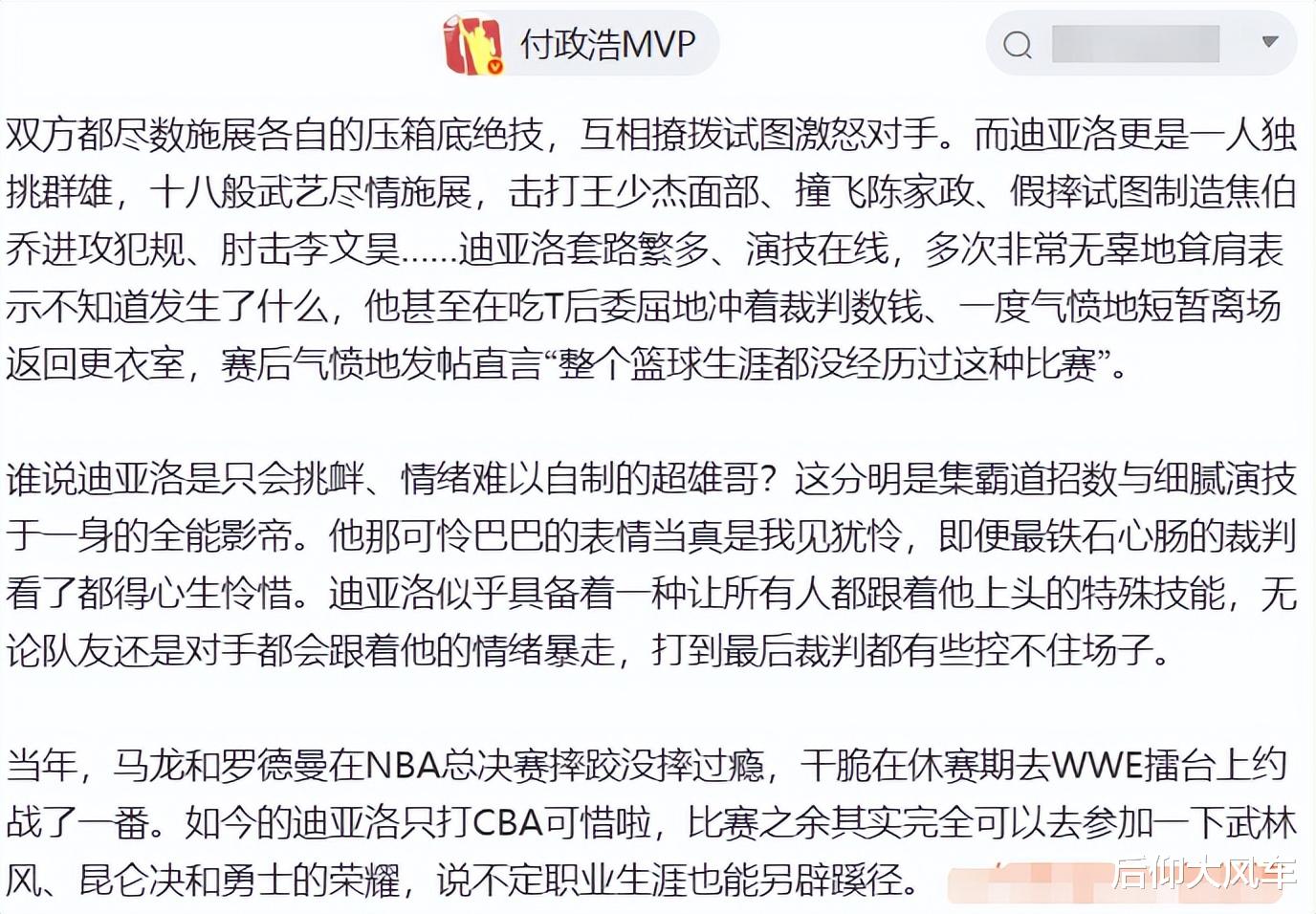 不妨来看看媒体人付政浩老师的精彩点评,赛后,付老师发表长文,表示这场晋粤大战并不是不是什么篮球比赛,而是一场未经官方认证的UFC狂野车轮战,对于迪亚洛昨晚多次争议动作,例如击打王少杰面部,撞飞陈家政,多次假摔试图制造进攻犯规、肘击李文昊、吃到技犯后对着裁判数钱等动作;