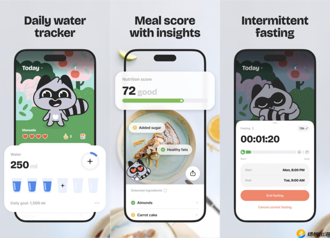 这一点从BitePal的icon设计就能明显看出来。它没有像大多数健康类应用那样,突出AI、识别或健康等元素,而是采用了一只可爱的小浣熊表情作为主视觉,并围绕这一形象构建整个应用体验。这种设计不仅赋予产品更强的亲和力,也避免了传统减肥应用常有的机械感,让用户更容易接受健康管理,而不是被刻意提醒“你在减肥”。