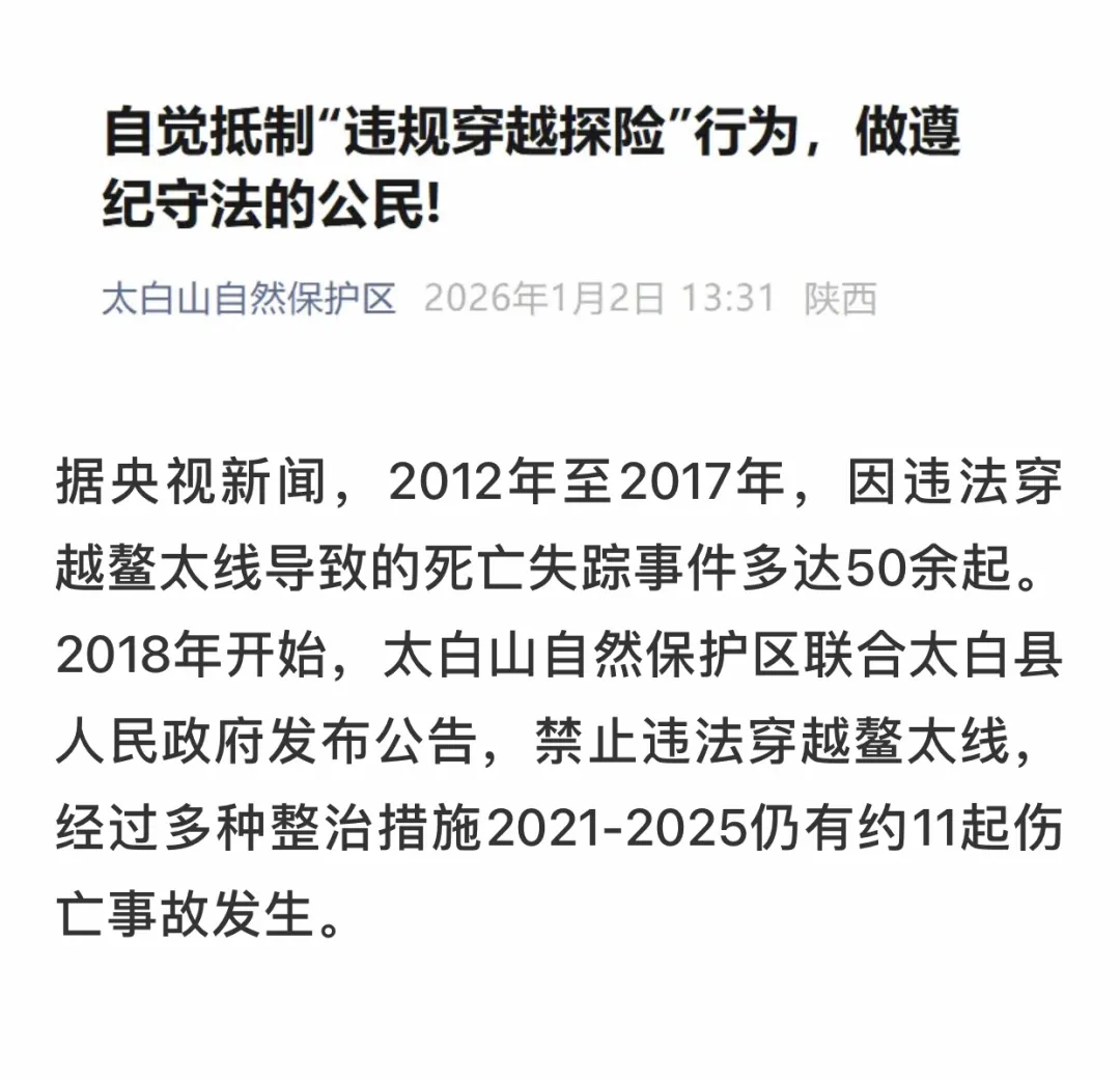 2026年元旦假期,秦岭山脉的“鳌太线”以两条生命的代价,再次将违规穿越的悲剧推至公众眼前。