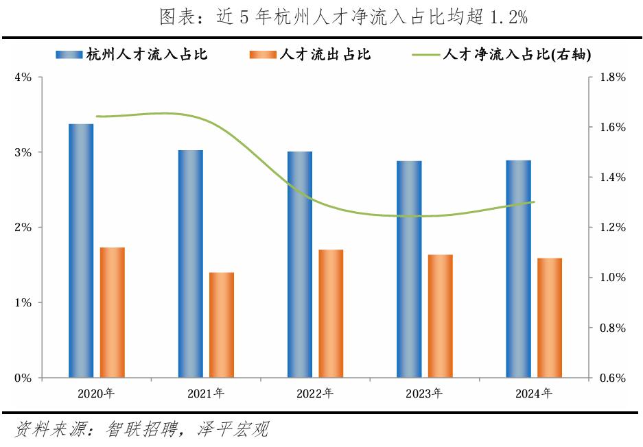 从人才流入流出看,2024年杭州全市常住人口同比增加10.2万人。人才方面,2020-2024年杭州人才流入占比较稳定,始终维持在3%左右,人才流出占比从2.0%降至1.6%,杭州留才能力较强。人才流入明显大于流出,使得人才净流入占比维持在较高水平,近5年均超1.2%。