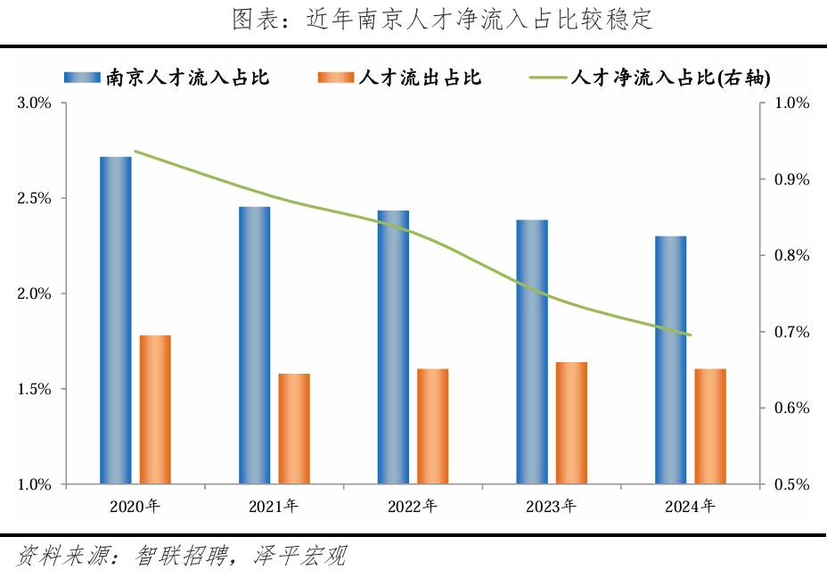 从人才流入流出看,2020-2024年南京人才流入占比从2.7%降至2.3%,人才流出占比从1.8%降至1.6%,变化幅度相对较小,使得近年南京人才净流入占比一直保持0.7%-1%的水平,基本稳定。