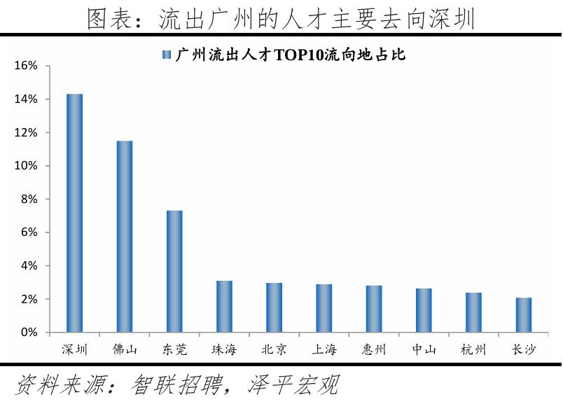 从去向看,广州人才流向的前十大城市合计占比51.9%,高于2023年的50.8%,集中度提升。其中珠三角城市为6个,合计占比41.6%。与之相比,北京流出人才中17%流向京津冀城市群,上海流出人才中22.3%流向长三角城市群,深圳流出人才中33.5%流向珠三角城市群,广州人才流向珠三角城市群城市的比重相对更高。人才流出一方面是因为珠三角多为粤语城市、文化相近,流动相对频繁。另一方面是广州高校数量较多,广东省人才为求学向广州集聚,毕业后从广州回流至省内其他城市。根据教育部数据,广州普通高校数、211高校数分别为37、6所,分别排名第5、6名。2024年广州普通本专科在校生人数达150万人。