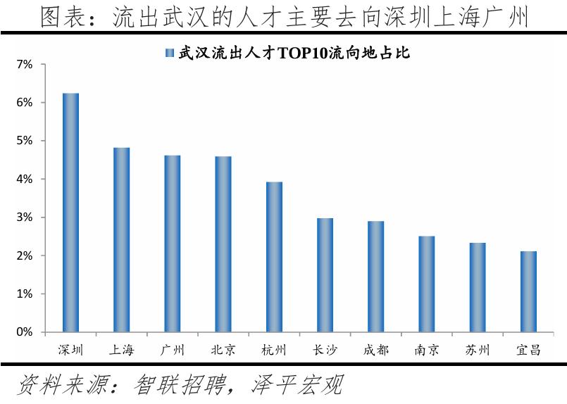 从来源看,人才流向武汉的前十大城市合计占比达32.5%,低于2023年的36.9%,人才来源地更广泛,人才来自郑州的最多,占比4.6%。人才流入武汉主要因为2017年开始实施“百万大学生留汉创业就业工程”吸引毕业生。2021年成立人才集团有限公司,专门为城市引进人才,并且武汉继续放宽落户条件,接近“零门槛”,落户开放度在国家中心城市中最大。2024年锚定“新质”荐新才,启动英才计划集中举荐等,吸引各类人才来汉就业创业。此外,作为在校大学生数量全国第三的城市,武汉留汉人才明显增加。7-8年间,留汉就业创业的大学生已超过200万,近年持续超额完成“学子留汉”工程计划(每年10万人)。从去向看,武汉人才流向的前十大城市合计占比达37%,低于2023年的39.7%。其中,前往深圳、上海、广州占比较大,分别为6.2%、4.8%、4.6%。