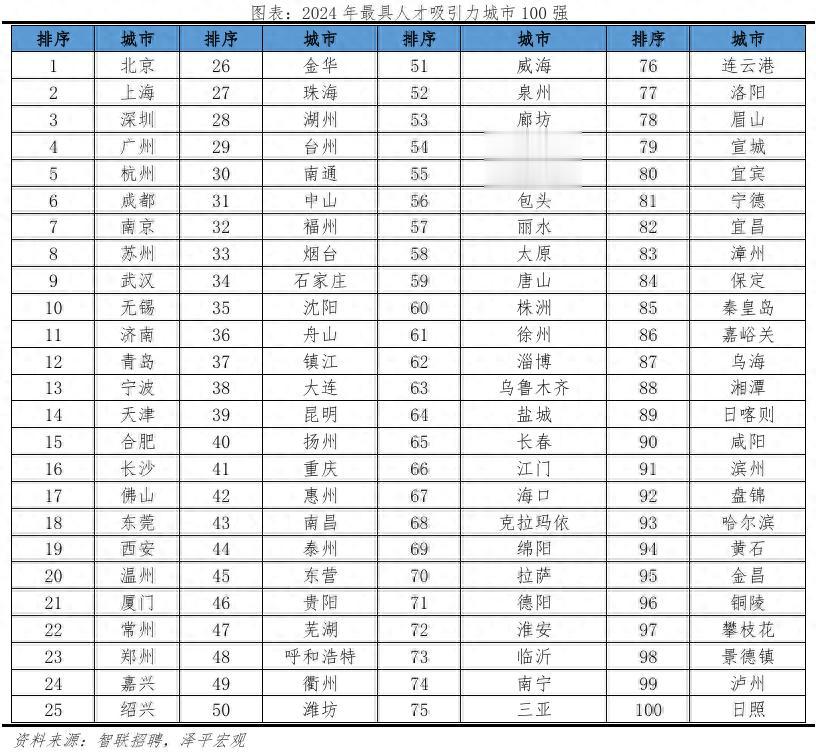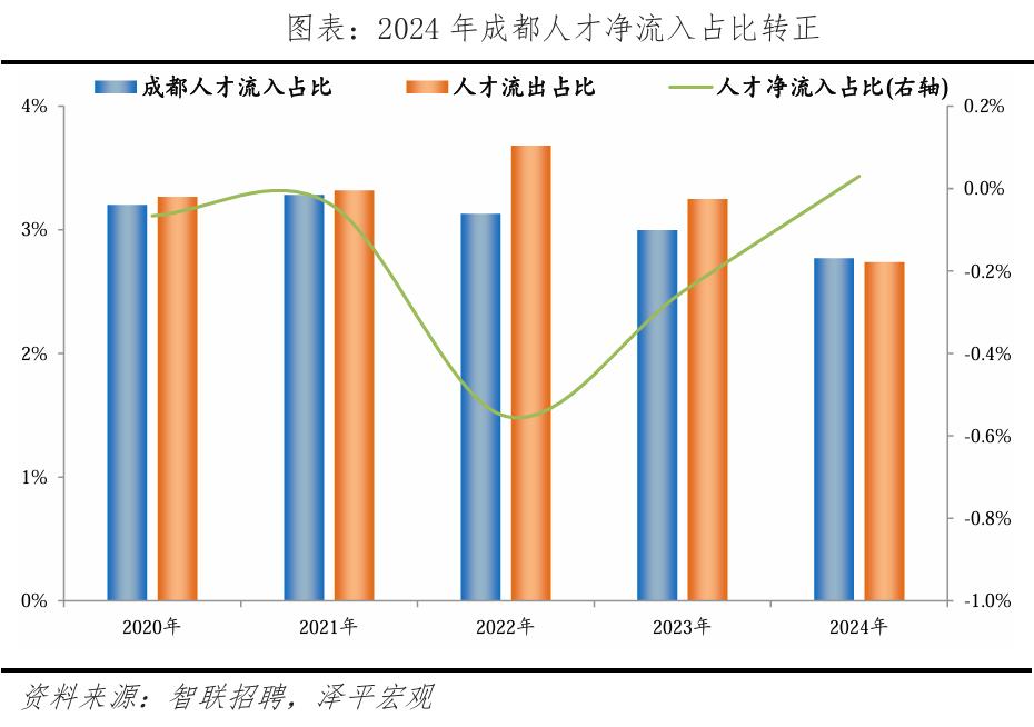 3)深圳:2024年常住人口同比增加20万人,居全国前列,人才也保持净流入,2020-2024年人才净流入占比分别为1.3%、1.4%、1.1%、1.2%、1.2%,人才集聚明显,主因深圳经济发展速度快,拥有低于北京和上海的落户门槛,以及各类创新的产业,能提供较多工作岗位等。