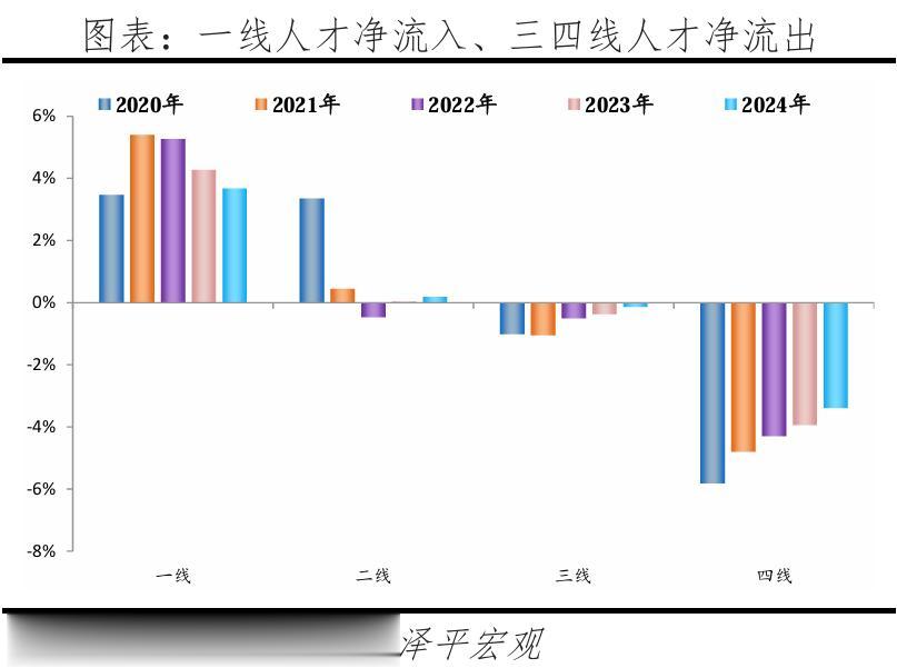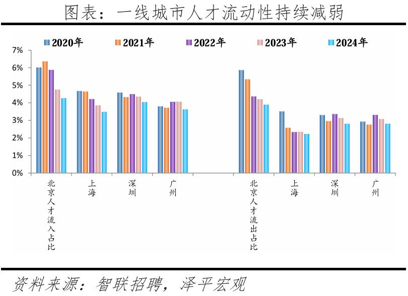 从人才流入流出看,2020-2024年一线人才流入占比持续下降,从19.1%降至15.4%、流出占比从15.6%降至11.7%,流出占比降幅远大于流入占比;二线人才流入、流出占比均下降;三四线城市流入流出占比均有所增加,流出占比增幅大于流入占比。