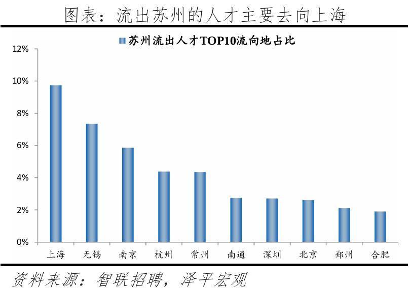从来源看,人才流向苏州的十大城市合计占比达到34%,低于2023年的35%,来源地更广泛。其中7个城市为长三角地区城市,合计占比达到24.6%,苏州与长三角的城市人才交流较密切。人才流入主因苏州经济实力雄厚、创新发展领先,并且地处长三角腹地、距离上海最近,是资源外溢最大受益者,且制造业立市,提供大量岗位吸引人才。2024年苏州GDP为2.7万亿,居全国第六、江苏省第一,长三角地区第二;规上工业总产值4.7万亿元,稳居第2,仅次于深圳;高新技术企业超1.74万家,保持全国第4。国家级科技型中小企业达到2.43万家,保持全国第1。