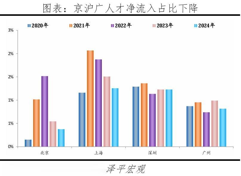 从人才净流入占比看,2024年京沪广同比小幅下降,深圳持平,京沪深广分别为0.4%、1.3%、1.2%、0.8%,上海最高。由于北京严控人口、产业疏解等,人才流入占比减少,2024年人才净流入占比较2023年下降0.2个百分点;上海人才净流入占比变动呈倒“V”型,2024年人才净流入占比为1.3%,较2023年下降0.3个百分点,但仍是榜首;2024年深圳人才净流入占比稳定,广州人才净流入占比较2023年下降。