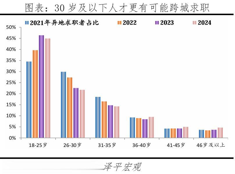 2)从年龄看,2024年流动人才中18-30岁人才占比67%,高于求职总体的61%,30岁以下人才更有可能跨城求职。2024年流动人才中18-25岁、26-30岁、31-35岁、36-40岁、41-45岁、46岁及以上分别占比44.9%、21.7%、14.2%、9.5%、5.0%、4.7%,各年龄段分别较求职总体高4.9、0.4、-2.1、-1.5、-0.8、-0.9个百分点,说明30岁及以下人才更有可能跨城求职。2021-2024年流动人才中30岁及以下占比分别为64.4%、66.9%、68.9%、66.6%。