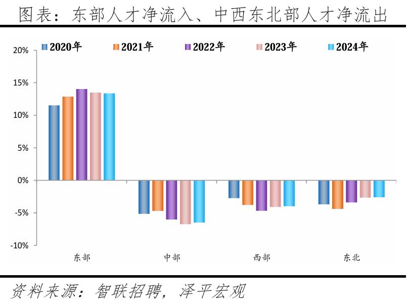 1)分地区看,2024年东部人才净流入占比连续2年下降,西部、东北部人才净流入占比有所回升,东部、中部、西部、东北人才净流入占比分别为13.4%、-6.5%、-4.0%、-2.6%,东部人才依旧持续集聚,中部、西部、东北持续净流出。