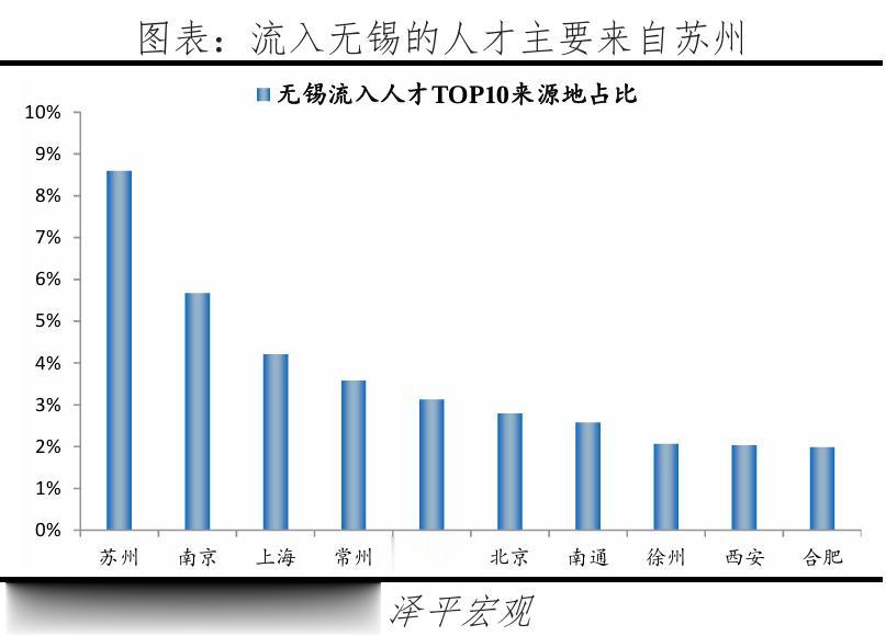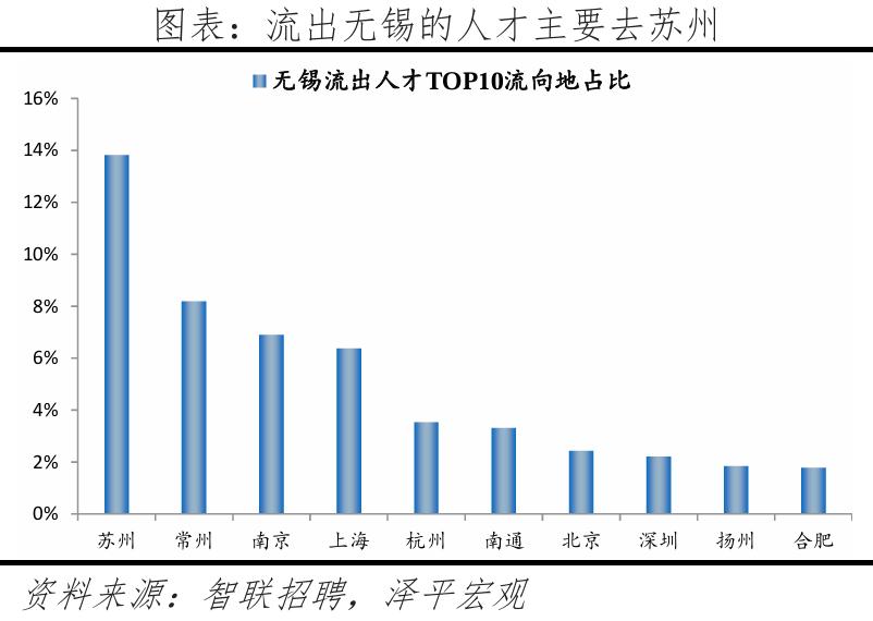 从来源看,人才流向无锡的十大城市合计占比36.6%,低于2023年的37.3%。其中长三角城市升至5个,合计占比为26.6%。人才流入无锡主要因物联网、集成电路等产业发展迅速,且为与同梯队城市相比,无锡工作机会较多,生活成本相对较小。根据无锡市政府数据,2024年物联网、集成电路等7个集群规模超2000亿元,入选国家先进制造业集群2个、累计5个;入围中国“企业、制造业、服务业、民营企业”500强榜单企业12家、23家、19家、25家,均列江苏省第一。同时,无锡引才举措较多,2016年无锡出台“太湖人才计划”,重点支持引进、培育六类产业发展重点人才,制定工作补贴、薪酬补贴、安家补贴等各项福利政策,并不断更新迭代。还采用“以赛引才”模式,针对重点产业发展方向,开办创新创业大赛,吸引海内外人才等。2024年在“中国年度最佳雇主”评选中,无锡连续第6年荣获“中国年度最佳引才城市”。2024年,无锡引进大学生10.2万人、高层次人才1.1万人。并出台《关于更大力度支持优秀青年人才来锡发展的十项措施》,发布年度重点产业紧缺人才需求目录,为人才引进提供精准指引。