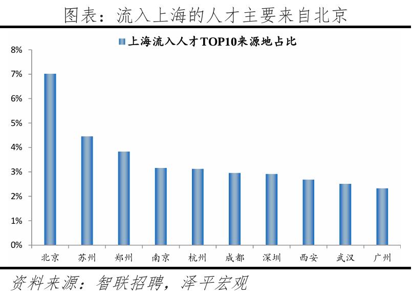 从来源看,2024年人才流向上海的前十大城市合计占比35%,低于2023年的36.1%,上海人才来源集中度继续下降。其中,长三角城市有3个,合计占比10.7%。人才流入上海主要因为其经济体量大、薪酬水平高,新经济促进政策有一定成效且上海放宽人才引进政策。2024年上海GDP规模达5.4万亿元,城镇人均可支配收入9.31万元,均位列全国第一。根据上海市经济和信息化委员会数据,2024年上海的中国互联网百强企业数为15家,位居全国各省市第2位,“在线新经济”发展效果明显。2022年开始上海人才落户条件放宽,高层次人才、重点机构急需人才、高技能人才等5类人才可直接落户上海,申办公示期由15天减少至5天。整体看,落户政策相对北京更宽松、流程更简化,更能吸引年轻优秀人才来沪就业。2024年上海户籍常住人口同比增加16.6万人。