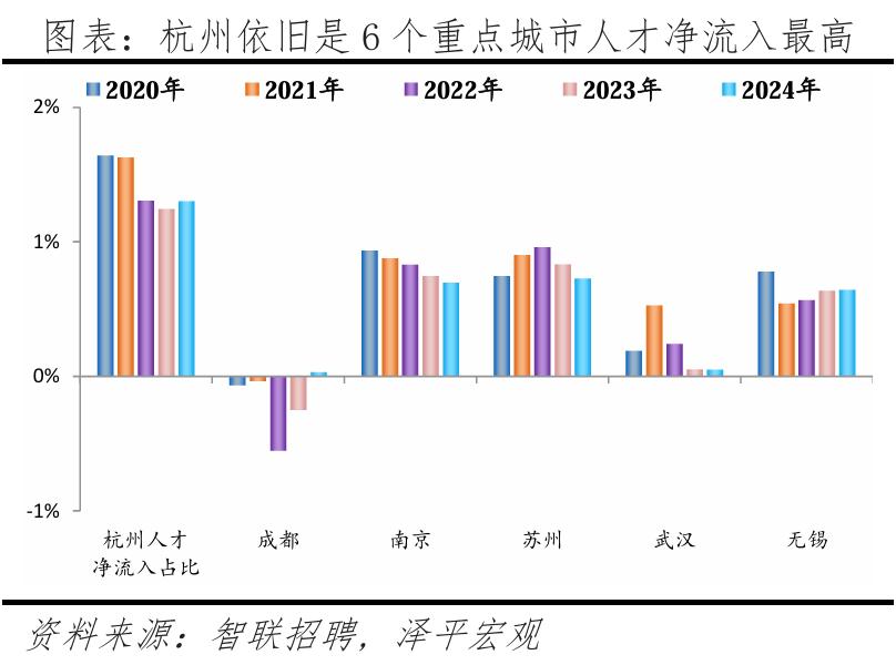 1)杭州:近5年杭州人才净流入保持在1.2%以上。2020-2024年人才净流入占比分别为1.6%、1.6%、1.3%、1.2%、1.3%,始终为正,人才吸引力排名稳居前列,主因杭州智能物联、生物医药、高端装备、新材料和绿色能源等领域产业发展迅速,且宜居的人文环境等。