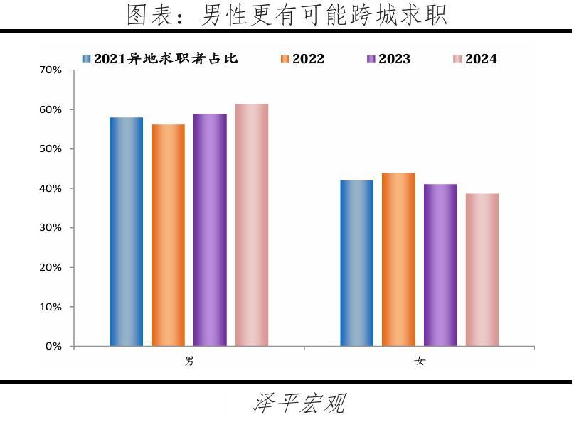 1)从性别看,2024年流动人才中男性占61%,高于求职总体的56%,男性依旧更可能跨城求职。2024年求职人才中男女比例为56:44,其中流动人才男女比例为61:39。2021、2022、2023年流动人才男女比例分别为58:42、56:44、59:41,2024年求职人才性别比增大。