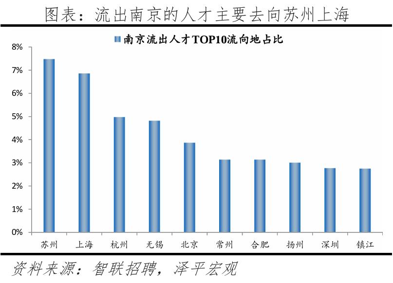 从来源看,人才流向南京的前十大城市合计占比达30.0%,低于2023年31.7%,人才来源集中度下降。其中,有5个是长三角地区,合计占比达16%,低于2023年的17.2%。人才流入南京主因其高端产业发展迅速、落户政策宽松等。近年南京培育壮大“2+6+6”创新型产业集群,打造“4+N”产业基金集群,2024年高新技术产业产值占规模以上工业比重达50.7%,同比提高0.8个百分点。另外,2018年南京实施“宁聚计划”,后续推出“人才强市25条”“重点产业人才7策”等,并全面升级人才政策体系,畅通人才“引育留用”全链条。2024年南京全市城镇新增就业21.9万人,南京籍离校未就业高校毕业生帮扶就业率90%以上,南京已连续五年获评“中国年度最佳促进就业城市”。