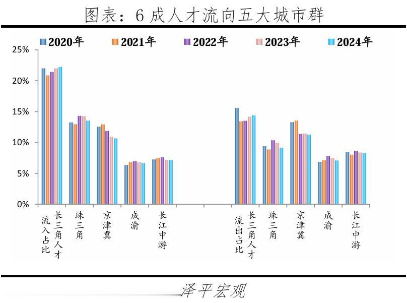 3)分城市群看,6成人才流向五大城市群,2024年长三角、珠三角人才持续集聚,京津冀人才连续两年呈净流出趋势,成渝、长江中游人才持续净流出。