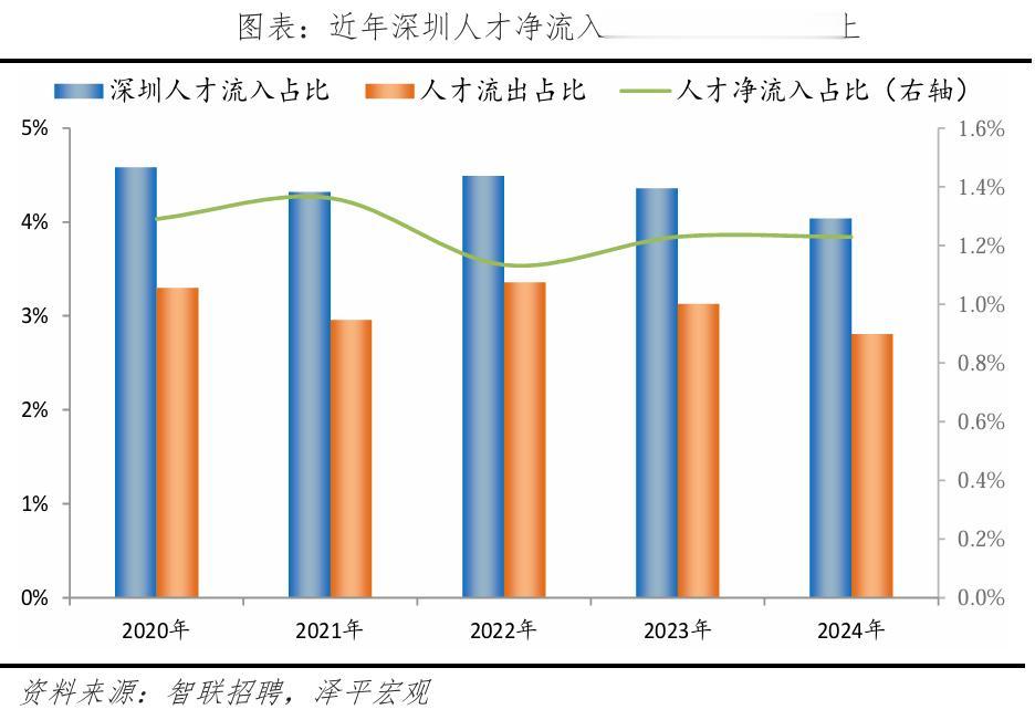 从人才流入流出占比看,2020-2024年深圳人才流入占比从4.6%降至4.0%,人才流出占比从3.3%降至2.8%,人才流动性下降。由于流入流出占比降幅相当,近年人才净流入占比保持平稳。