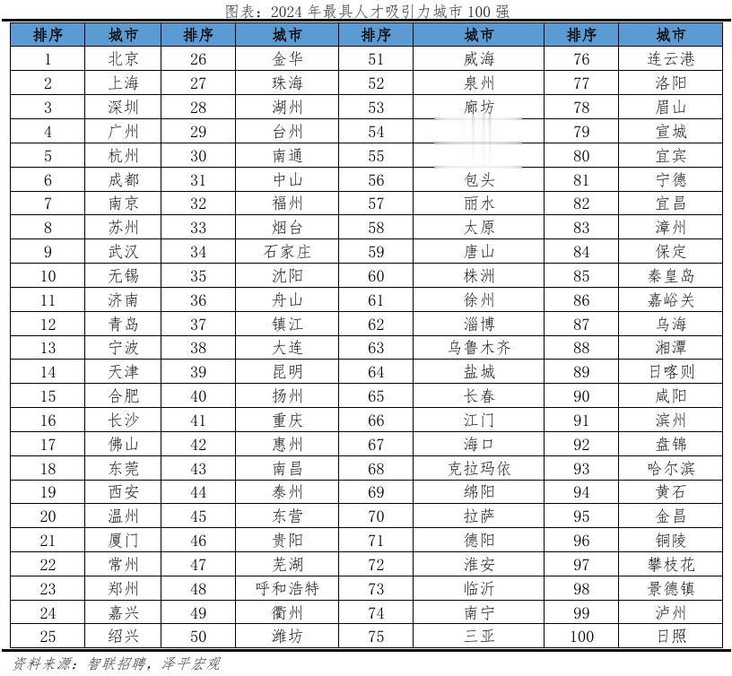 1)2024年中国最具人才吸引力城市100强:北京连续多年占据榜首。从结果看,2024年前十城市与2023年相比无位次变动,依旧是北京、上海、深圳、广州、杭州、成都、南京、苏州、武汉、无锡位居前十。
