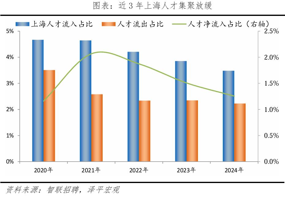 2)上海:近3年人才集聚放缓,2020-2024年上海人才净流入占比分别为1.2%、2.1%、1.9%、1.5%、1.3%,人才集聚。由于上海经济体量大、薪酬水平高、新经济促进政策初见成效,吸引人才来沪就业,叠加放宽落户政策等,减少人才流出。
