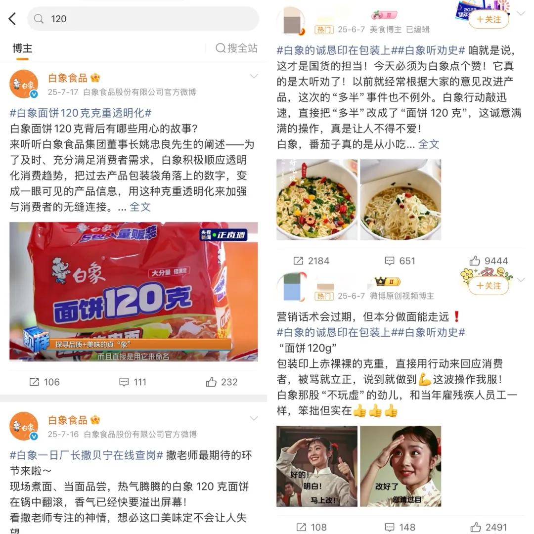 此前白象“多半”系列产品因注册商标引发争议后,品牌仅用48小时便宣布将产品名称直接改为面饼120克 / 110克,把模糊表达改成用户最在意的确定性信息,这也是在用最直观的信息回应用户的诉求。