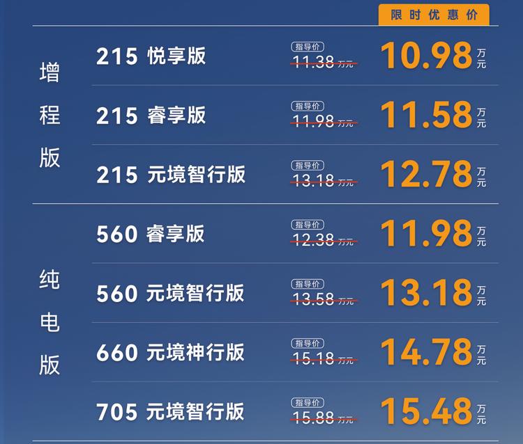 其中阿尔法T5纯电版官方指导价12.38-15.88万元,优惠或售价11.98-15.48万元;阿尔法T5增程版官方指导价11.38-13.18万元,优惠或售价10.98-12.78万元,增程版本的价格门槛直降10000元。