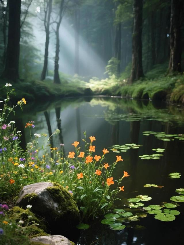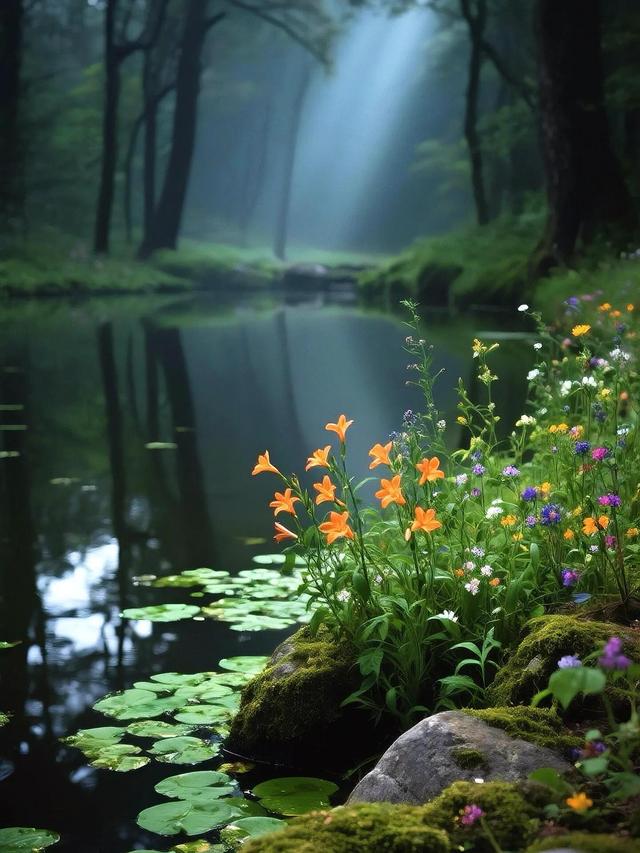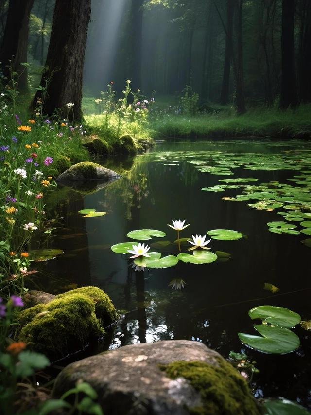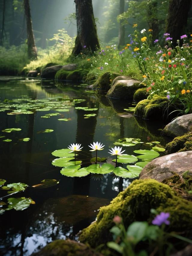 塘边,岩石上覆盖着厚厚的青苔,显示出岁月的痕迹和自然的生机。岩石旁,各色野花竞相绽放,白的纯洁、紫的高贵、黄的明媚,它们与绿叶相互映衬,构成了一幅五彩斑斓的画卷。