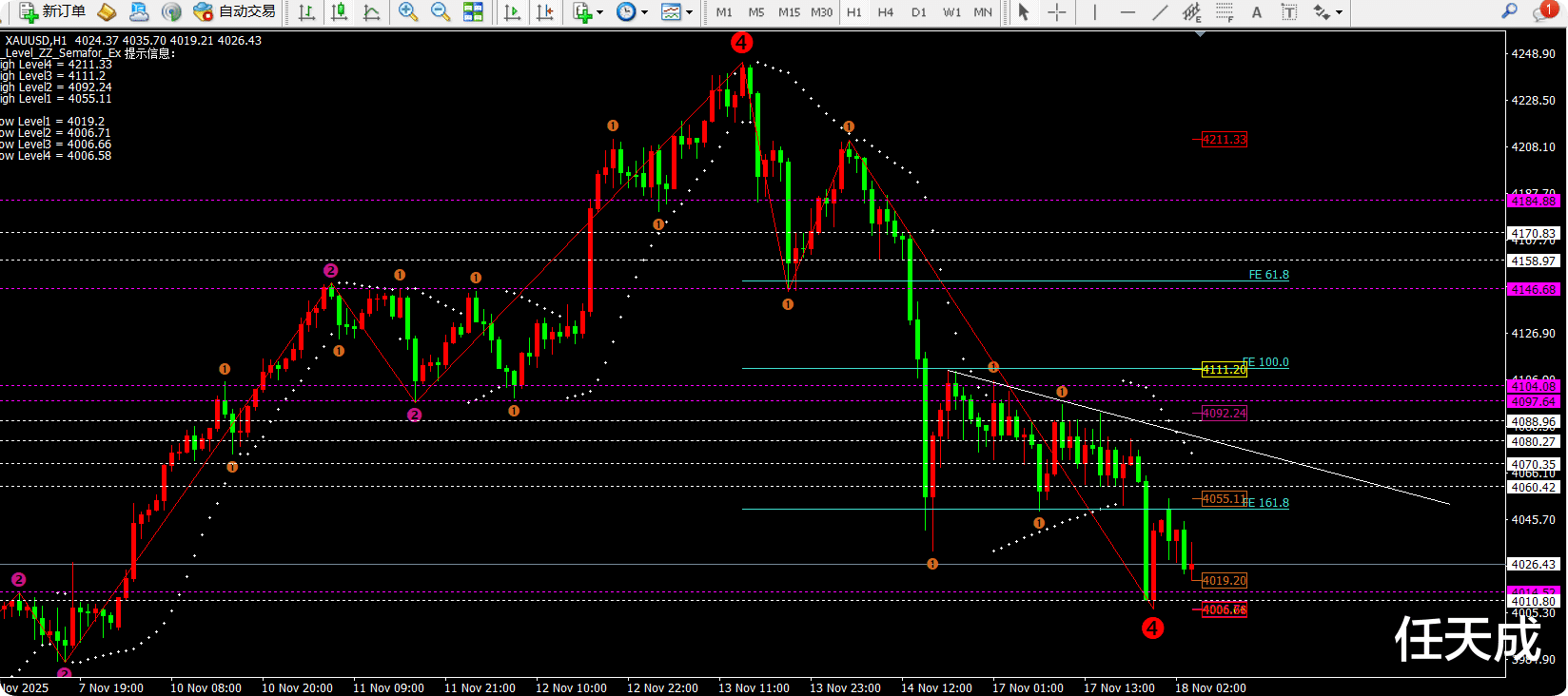 目前日线只有跌破昨日低点4006-07才有可能继续下跌,反之可能反弹先试探4070-4080一线;而目前4小时和小时线都压制在4060-70附近,所以这里是我们今日的第一个压制点位。也就是目前我们的区间是4010-4070区间