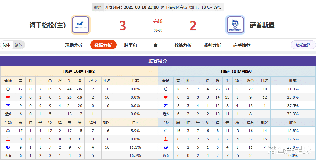 对阵背景:这是1场挪超的对决,对阵双方主客场战绩对比026vs341,主队主场战绩糟糕,客队客场战绩还不错,不败率较高。双方直接往绩交手334,中庸的往绩。但是双方近几次交手,本场的主队没有赢过,本场比赛判断筹码高看客队不败。