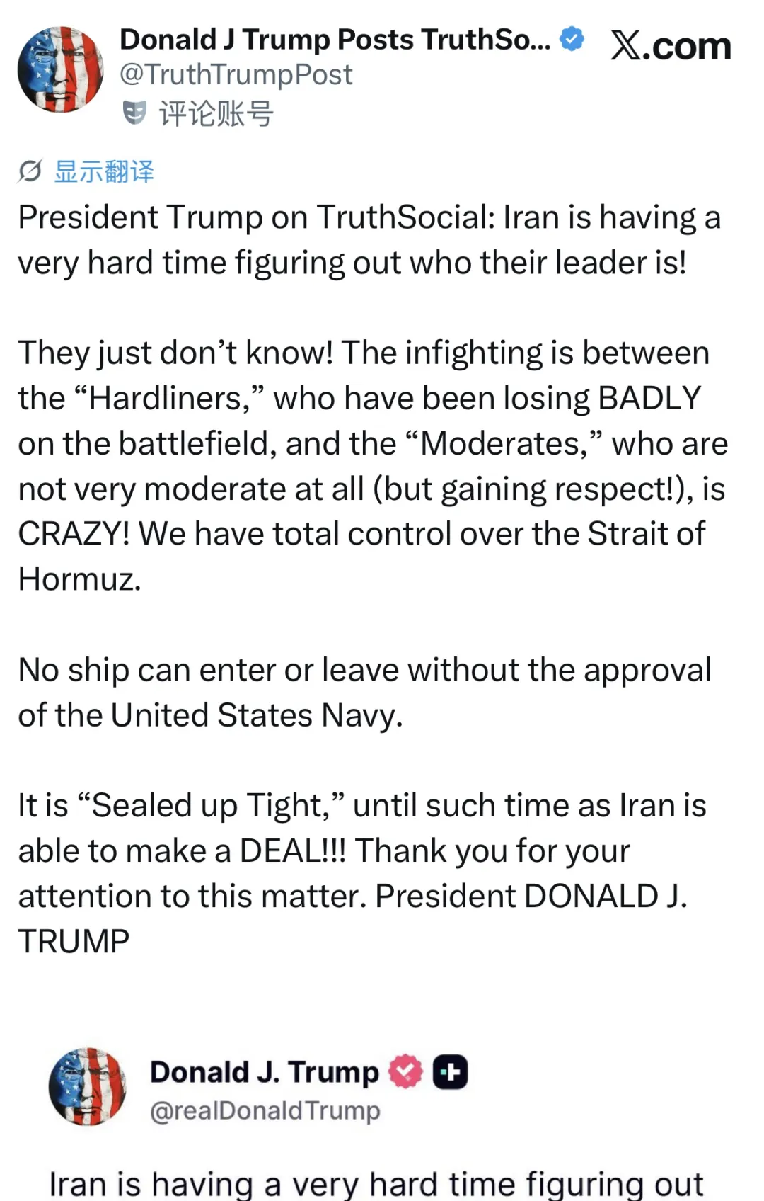1. 彻底锁死霍尔木兹海峡:特朗普宣称,目前美国海军已经完全控制了海峡,未经批准,任何船只不得进出。他要通过“极限窒息”的方式,直到伊朗签署一份让他满意的协议。