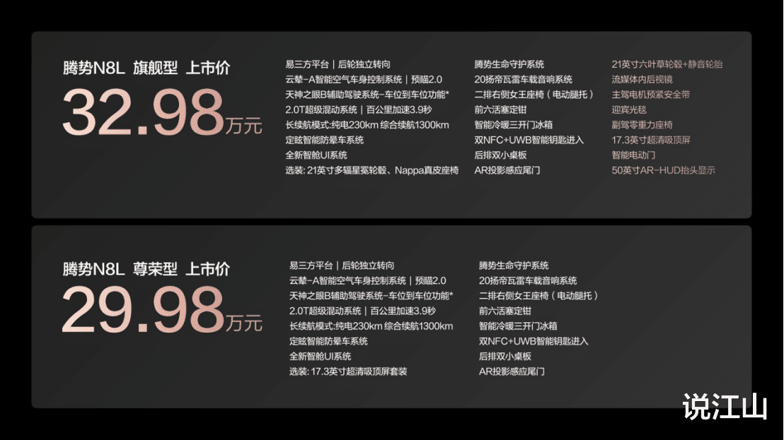腾势总经理李慧用三句话总结N8L,就是:超安全家庭大六座、超豪华移动大平层、超智能科技大座驾,以硬核技术实力重塑家庭大六座豪华SUV新标准,与每个热爱生活的家庭一起奔赴美好。