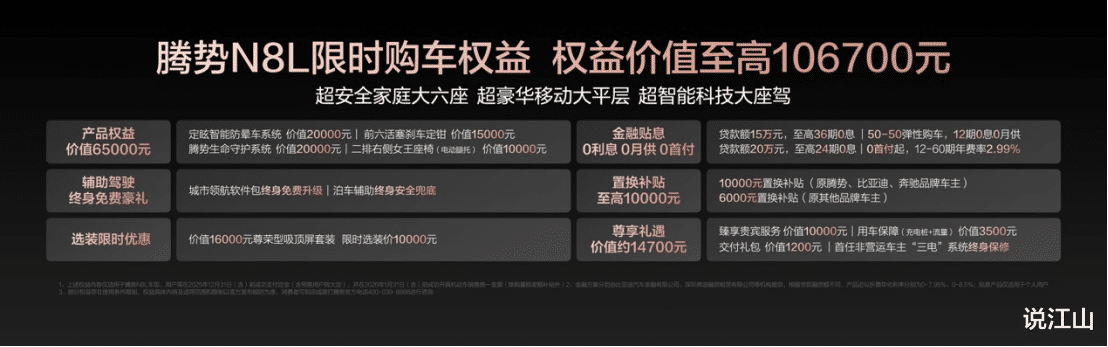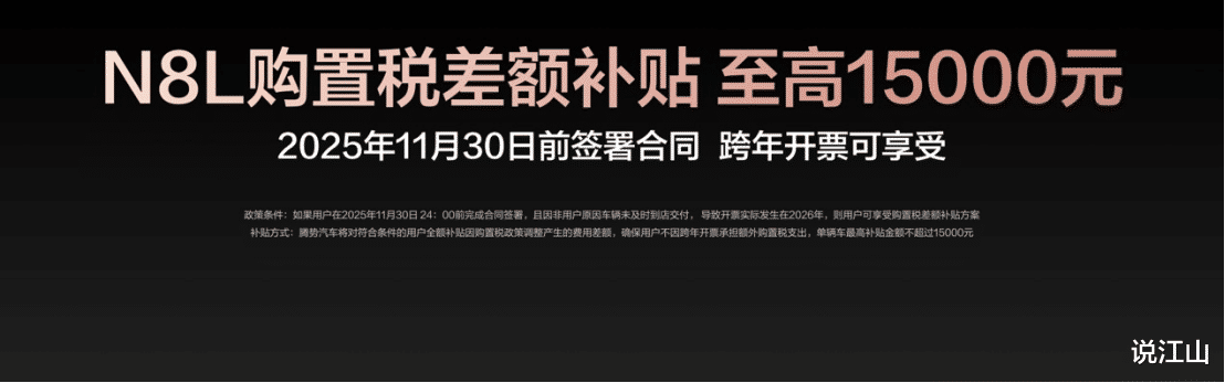 为回馈广大用户的支持与信赖,腾势N8L特别推出限时购车权益,权益价值至高10.67万元!包括价值1.7万元的三年免息,最高1万元的置换补贴。此外,不必担心因为交车晚,享受不到购置税补贴:在2025年11月30日24点前完成合同签署的用户,如果因非用户原因车辆未及时交付,导致开票实际发生在2026年,可享受购置税差额补贴,最高1.5万元!