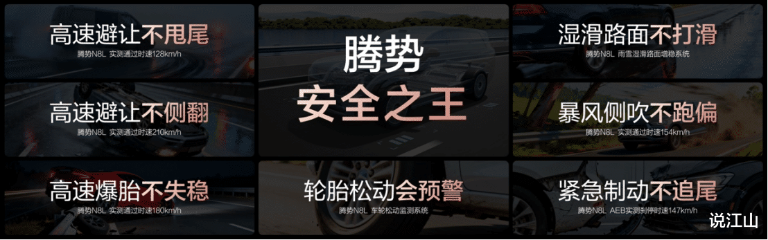 主动安全方面,得益于易三方,腾势N8L能够以128km/h高速避让不甩尾、210km/h高速避让(鱼钩测试)不侧翻、180km/h高速爆胎不失稳、154km/h暴风侧吹不跑偏、147km/h AEB自动紧急制动、不怕雨雪路面打滑、车轮松动监测系统,以科技安全守护家人出行安心。腾势汽车不愧被称为新能源汽车的“安全之王”。