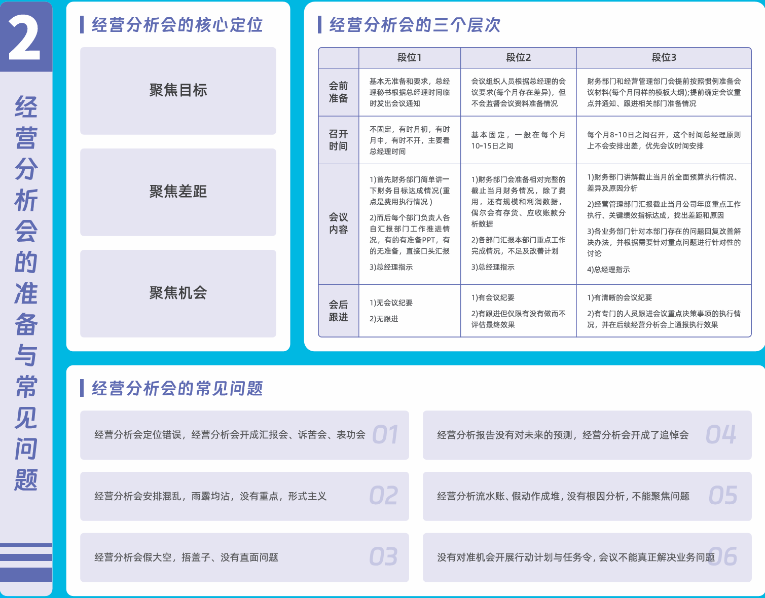最基础的层次,会议流程比较粗放,时间经常看老板日程临时定,内容就是财务报个数,业务部门讲讲流水账。开完会好像也就散了,后续谁跟进、结果怎么样,基本靠自觉。说实话,我第一次看到这类会议时,内心是很无力的。