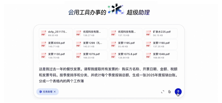 1、 报表整理更轻松:面对近百张格式不一的电子发票,只需拖入文件并输入指令“帮我生成年度报销台账”,千问就能自动识别关键信息,提取购买方、开票日期和金额,生成结构清晰的表格。