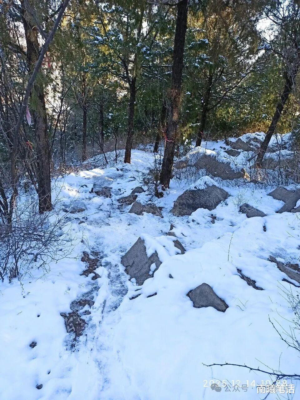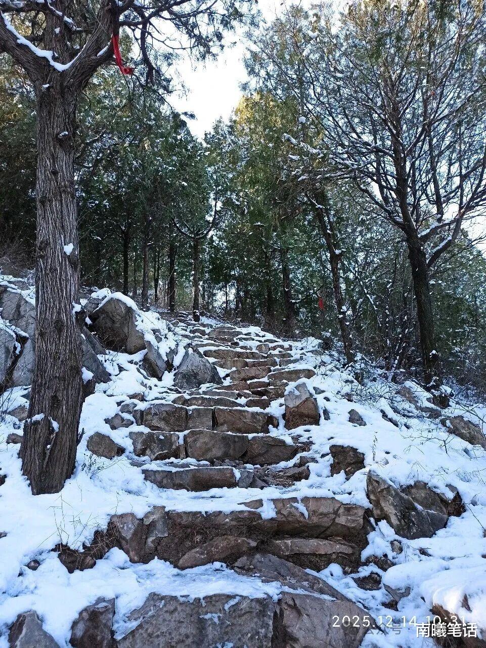 返回的时候,我没有原路返回,而是绕到后山在初雪后的台阶上缓缓下山,因为有积雪变成的冰冻,所以我集中精力,一路上竟然父母微微出汗了。走在绿色柏树的台阶上,树冠覆盖白雪皑皑,太好了这个感觉,仿若天地之间,唯我一人而已,在落雪的衬托下,心静也很静谧。