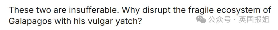 “这两人看着都难受,到底为啥要开着俗气的游艇去破坏加拉帕戈斯群岛脆弱的生态系统呢?”