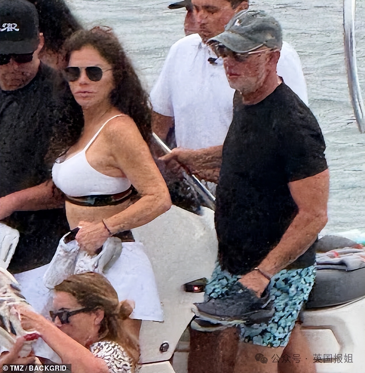 照片里能看到,56岁的桑切斯身穿白色内衣和配套迷你裙,62岁的贝索斯则穿着黑色T恤和蓝色泳裤。