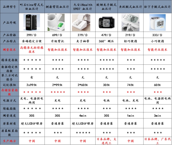 选择血压计时,难免会有些纠结,特别是面对琳琅满目的选项。为了避免被花哨的外表迷惑,查看参数数据是第一步。下面是这几款血压计的详细数据,大家可以借此对比它们的配置,帮助自己做出更理性的选择。