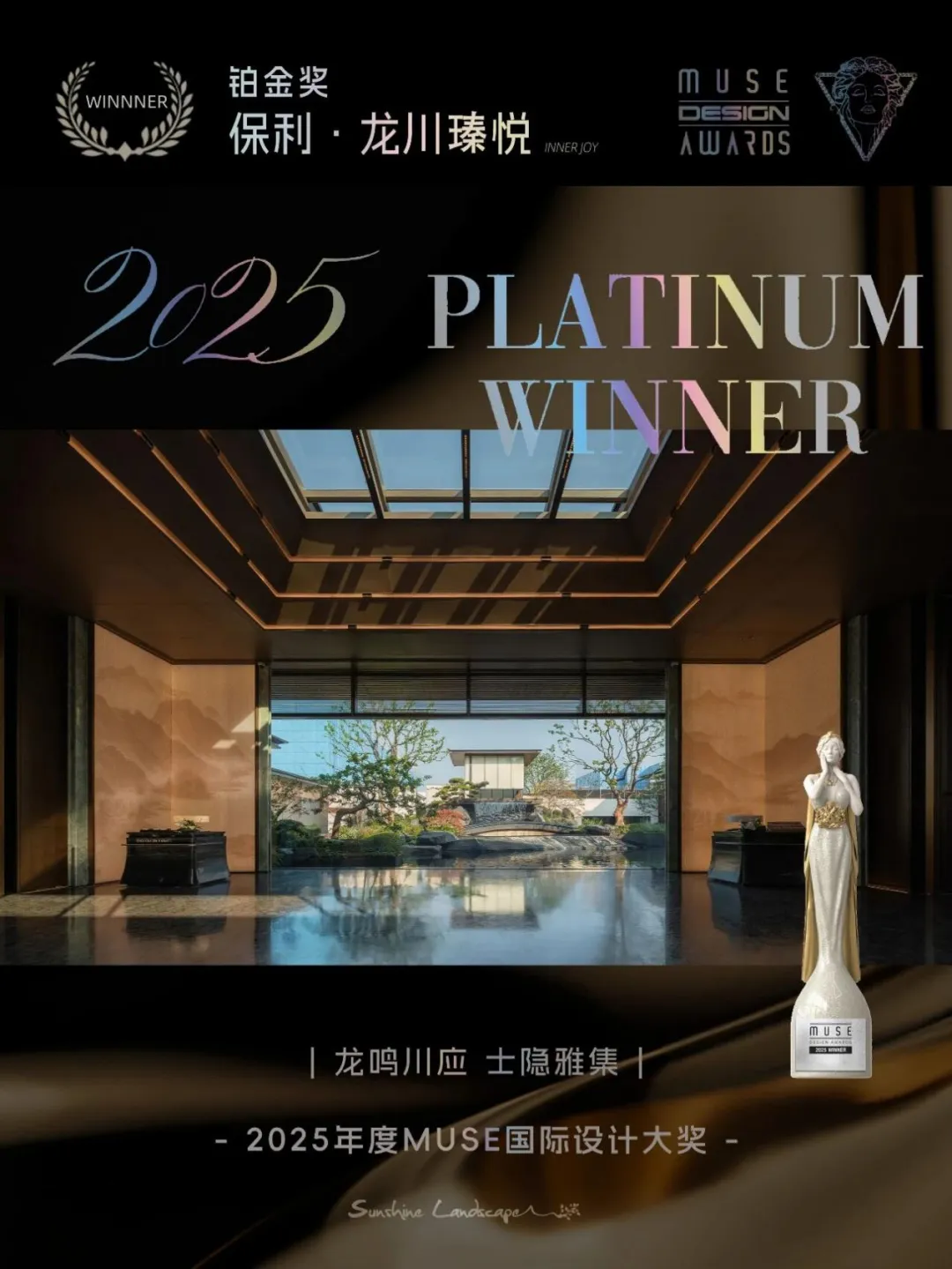 龙川瑧悦一举斩获2025年“全球创意设计领域奥斯卡”MUSE设计奖景观设计类至高荣誉铂金奖、TITAN地产大奖金奖及第20届金外滩奖最佳地产空间奖三项国际大奖;