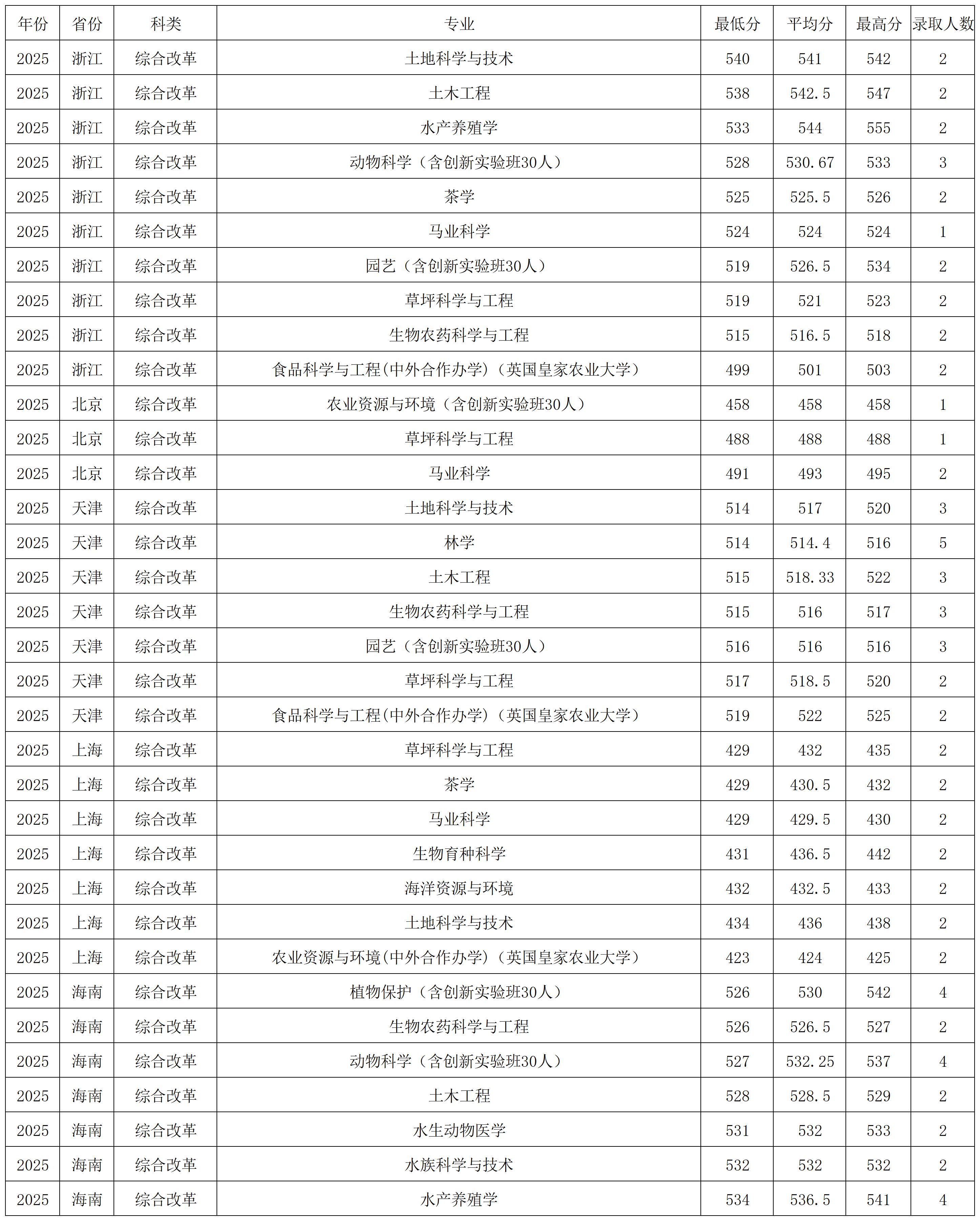 青岛农业大学2025年特殊招生类在各省各专业录取分数线