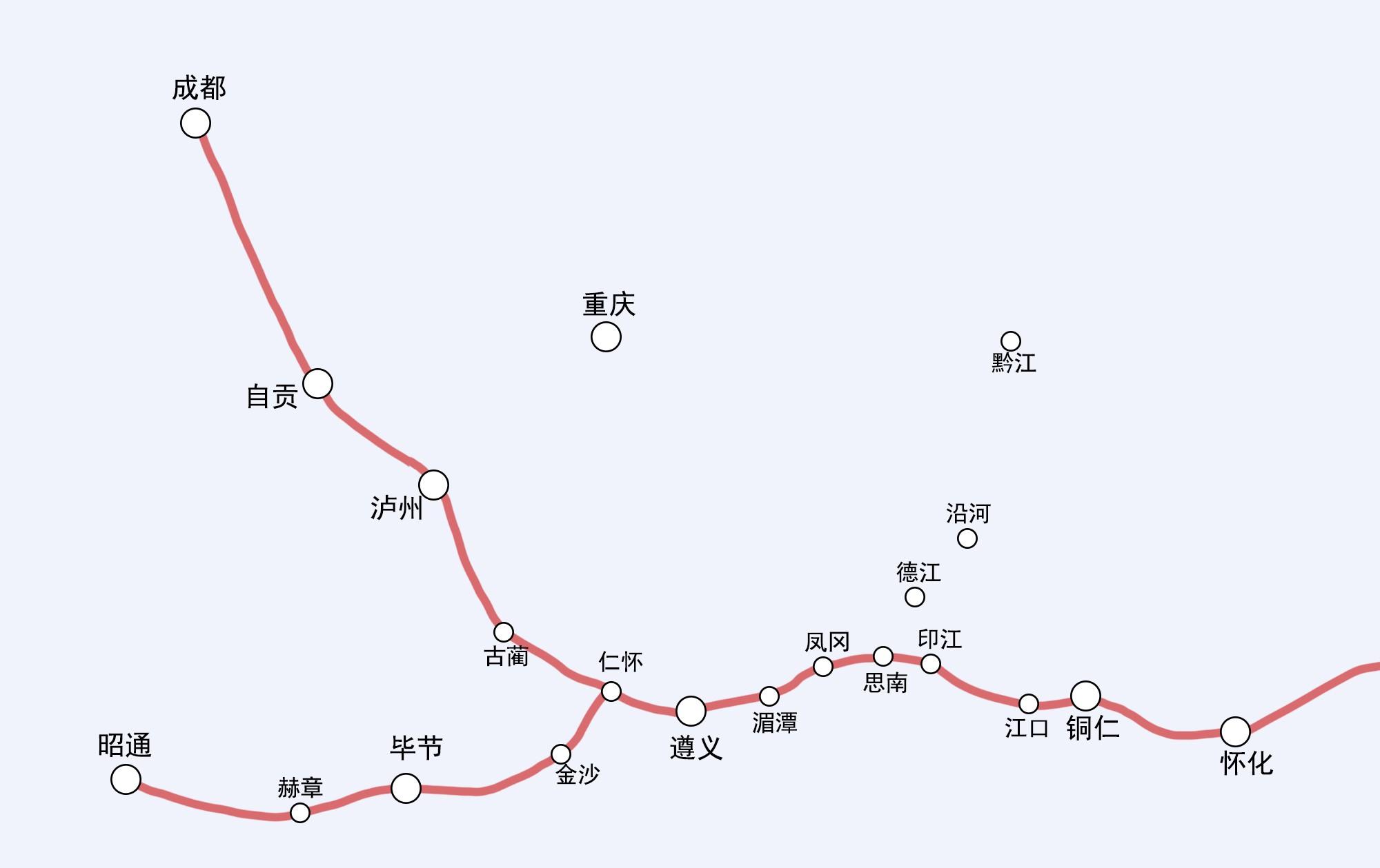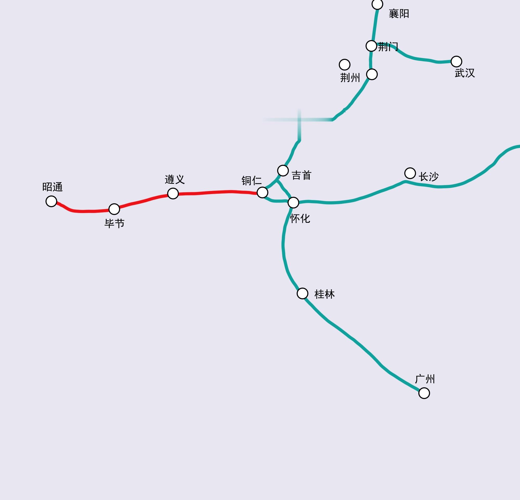 此外,昭黔铁路的线路设计上也有一些问题。昭黔铁路规划之时,中国尚未进入高铁时代。当初设计昭黔铁路的目的是让贵州拥有一条可以北上中原的大通道,一旦铁路修建后,贵阳、遵义、毕节等地区的客流、物流就可以经过黔江、恩施到达湖北、河南,连接华中、华北,如此就可以不用从湖南绕行了。
