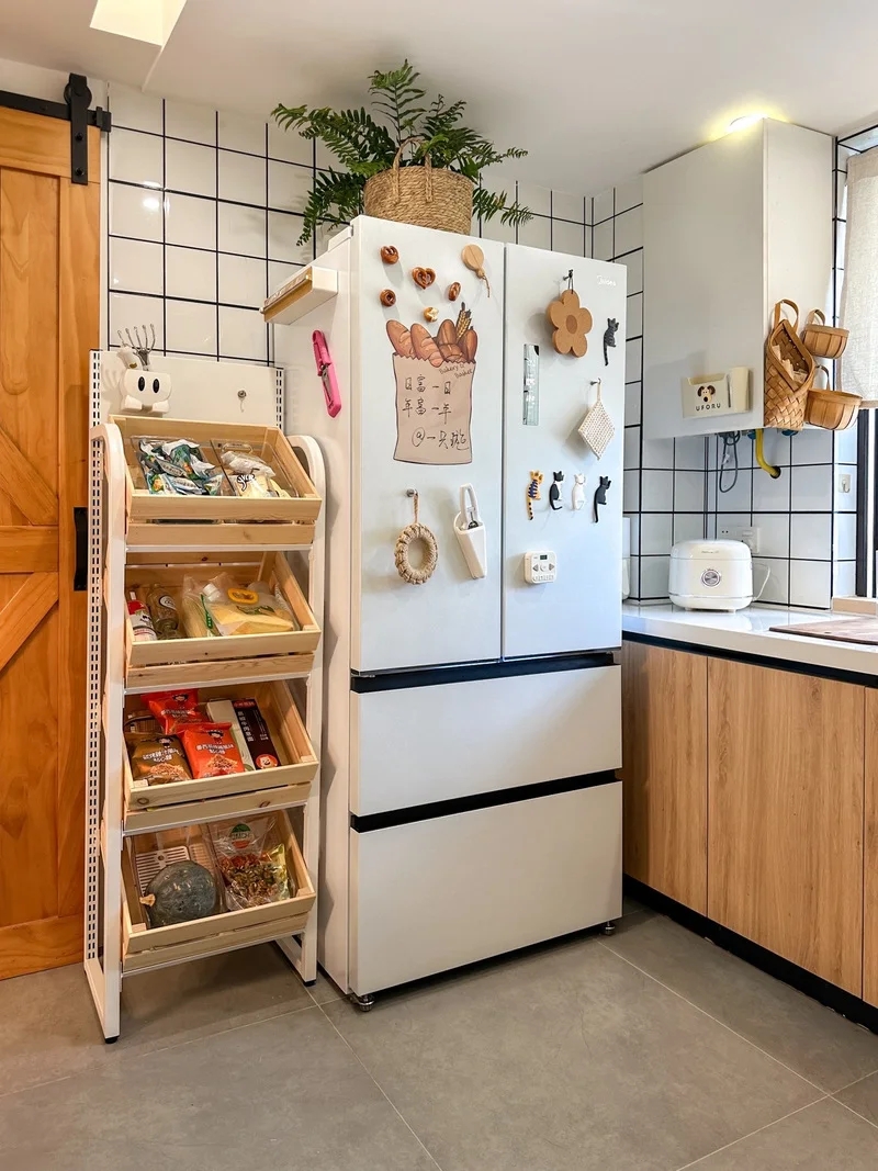 法式冰箱的容量相比十字对开门、对开门冰箱等,容量相对较小,占用的空间也要小很多。目前市场上法式冰箱的容量普遍在300-500L之间,加上其窄宽度、高机身的设计,更节省横向空间,非常适合小户型厨房的大容量存储需求。