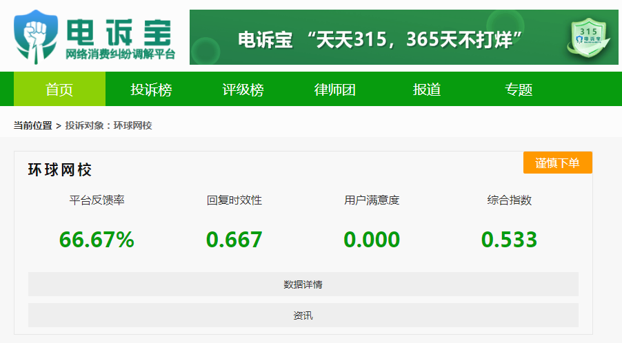 2025年全年,根据“电诉宝”2025年至今受理的数字教育领域用户有效投诉显示(依据投诉量排行),环球网校排名第12位,最新评级为“谨慎下单”。其他被投诉的类似平台依次为:中安建培、尚德机构、一只船教育、帮考网、赛优教育、对啊网、嗨学网、潭州教育、高顿教育、帮考教育、深海教育、正保会计网校、恒企教育、高教通、中职通、芸学教育、聚力成师教育、武汉聚师在线教育、中公教育、潭州课堂、大鹏教育、明世在线、学慧网、聚才木羽等。