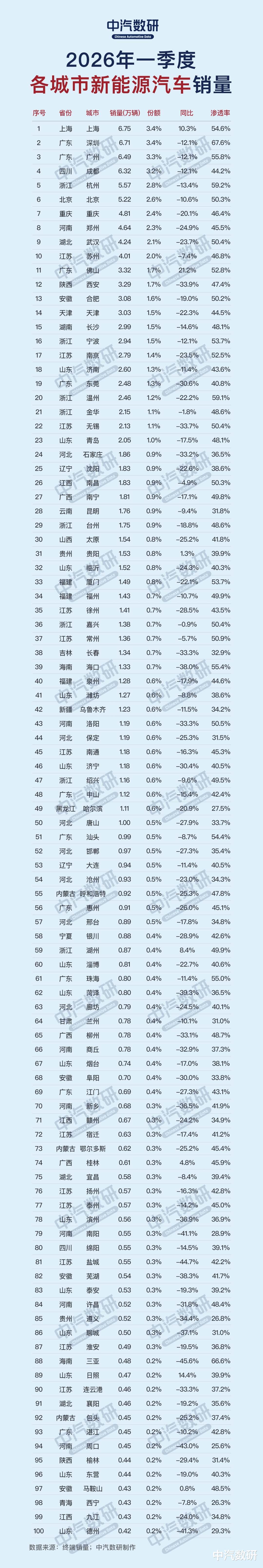 榜单显示,新能源汽车销量排名TOP10的城市为上海、深圳、广州、成都、杭州、北京、重庆、郑州、武汉、苏州,TOP10城市合计份额占全国的27.5%。TOP10中,仅上海一城同比逆势增长,销量6.75万辆(+10.3%),其余九城全陷负增长。深圳、广州销量同比下滑12.1%,排在第二至三位,渗透率分别为67.6%、55.8%;重庆、郑州、武汉同比跌幅超20%,成为前十城跌幅最深的城市。